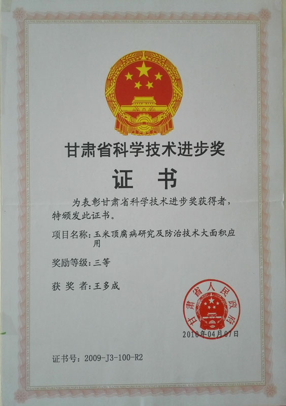 2010年榮獲甘肅省科學(xué)技術(shù)進(jìn)步三等獎(jiǎng)證書(shū)